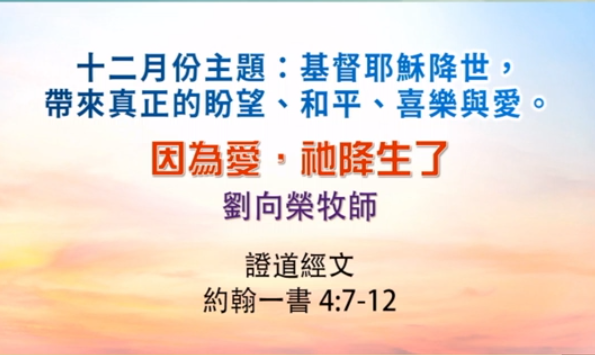 2025年12月21日 將臨期第四主日 合堂崇拜 証道題目:因爲愛,祂降生了 講員:劉向榮牧師 証道經文:約翰一書 4:7–12