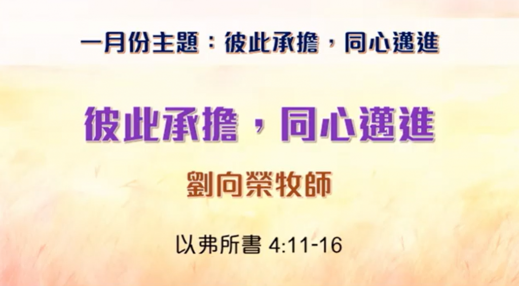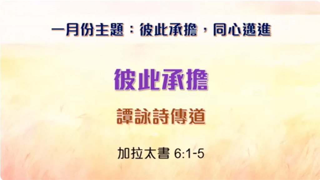 2026年1月11日 國語堂主日崇拜 証道題目:彼此承擔 講員:譚詠詩傳道 經文: 加拉太書 6:1-5