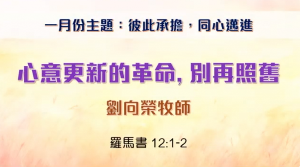 2026年1月18日 粵語堂主日崇拜 証道題目:心意更新的革命:別再照舊 講員:劉向榮牧師 証道經文:羅馬書12:1-2