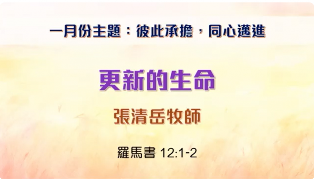 2026年1月18日 國語堂主日崇拜 証道題目:更新的生命 講員:張清岳牧師 証道經文:羅馬書12:1-2