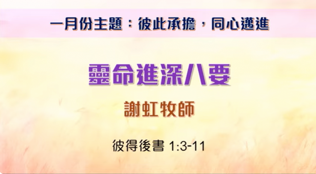 2026年1月25日 國語堂主日崇拜 証道題目:靈命進深八要 講員:謝虹牧師 証道經文:彼得後書 1:3-11